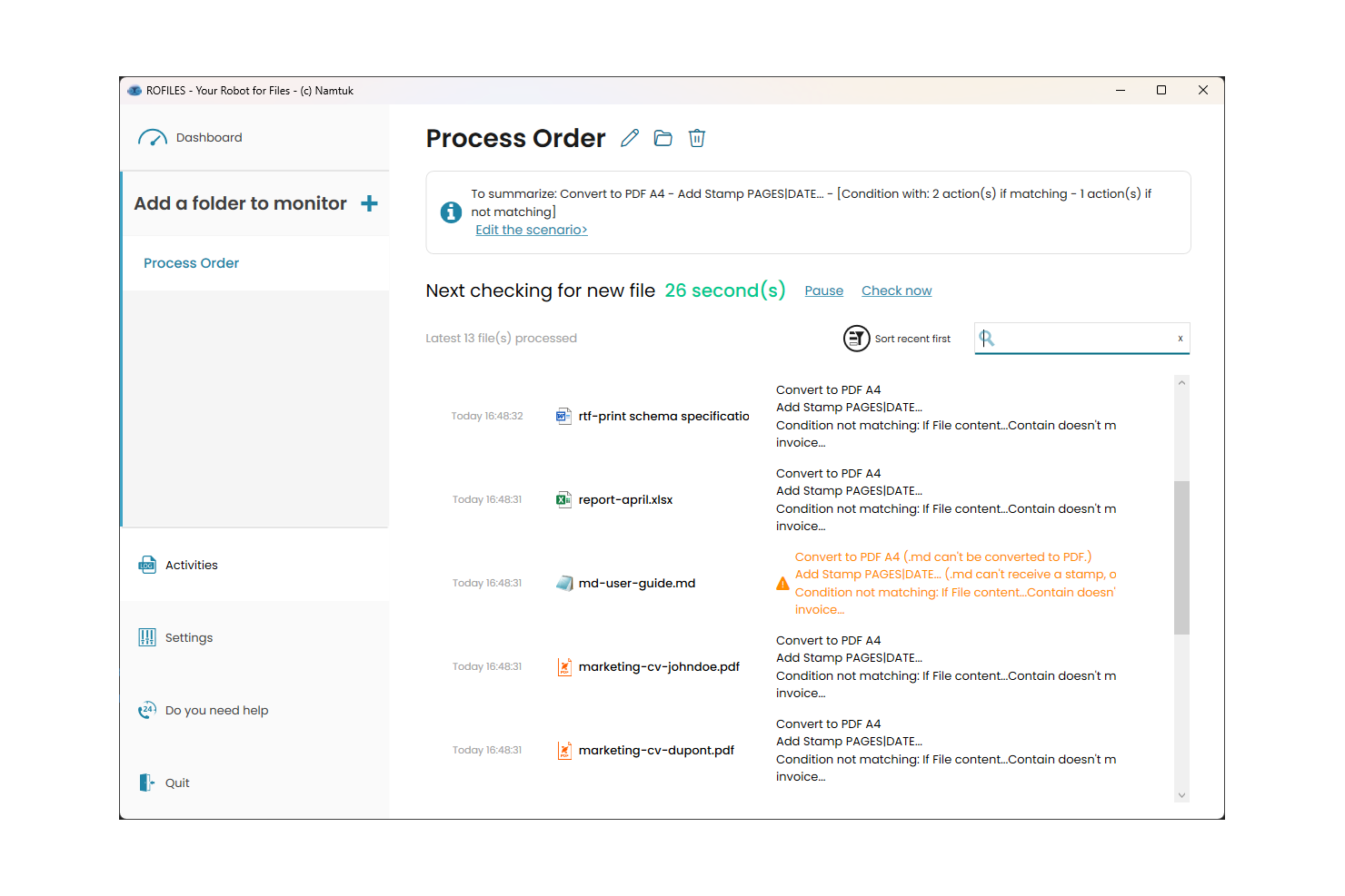 Unlock the power of automated file processing with ROFILES by Namtuk. Designed for IT professionals, this versatile Windows tool automates actions on files across PCs and servers. ROFILES monitors specified folders, triggering custom workflows upon file arrival. Workflows utilize "if/then" logic and combine actions, giving you precise control over file handling.