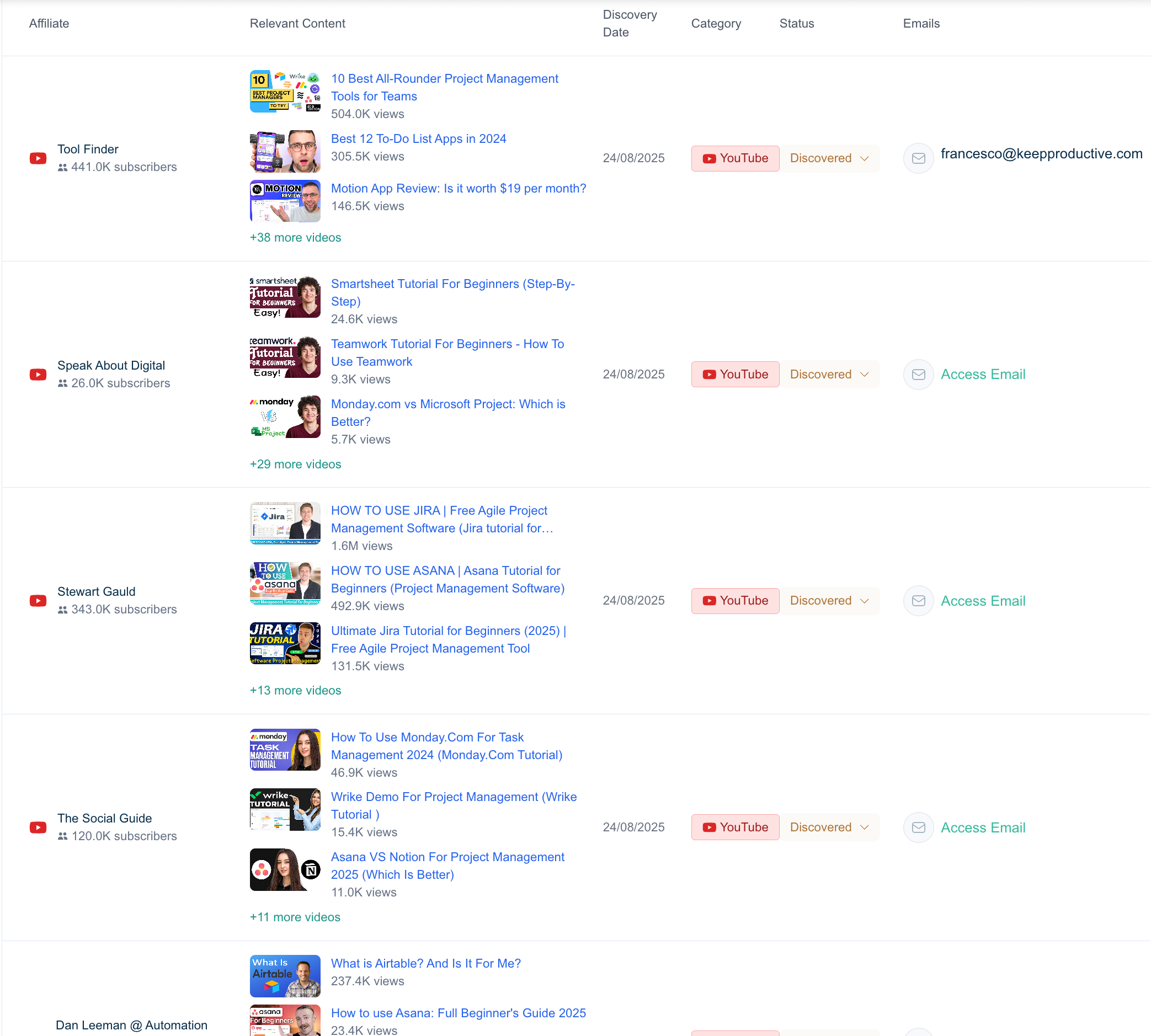 Find hundreds of affiliates ranking on Google or publishing on YouTube in their niche