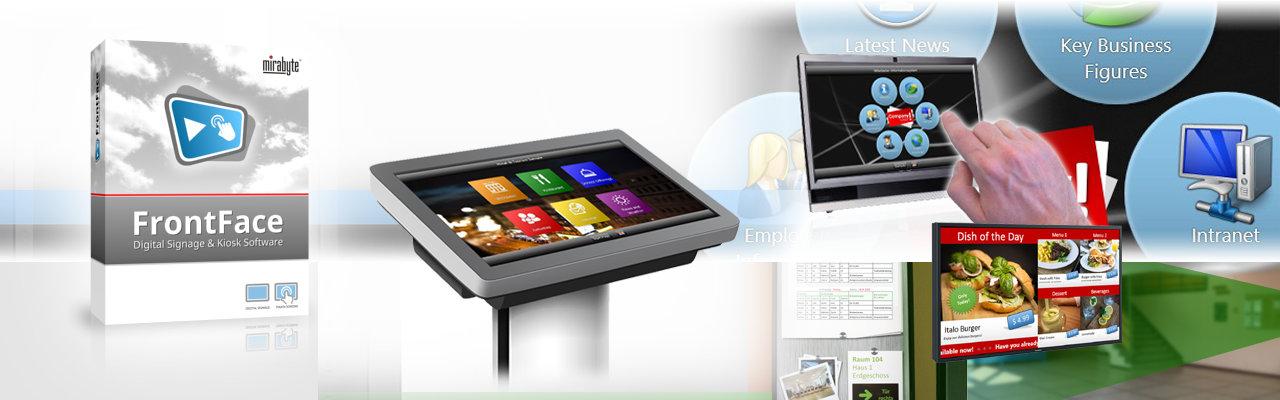 With FrontFace, you can create classic, non-interactive digital signage applications, such as advertising and information screens, dashboards, and reception screens, as well as sophisticated, interactive touchscreen interfaces. You can also create interactive exhibits for exhibitions, museums, and trade fairs, as well as information kiosks and self-service terminals.